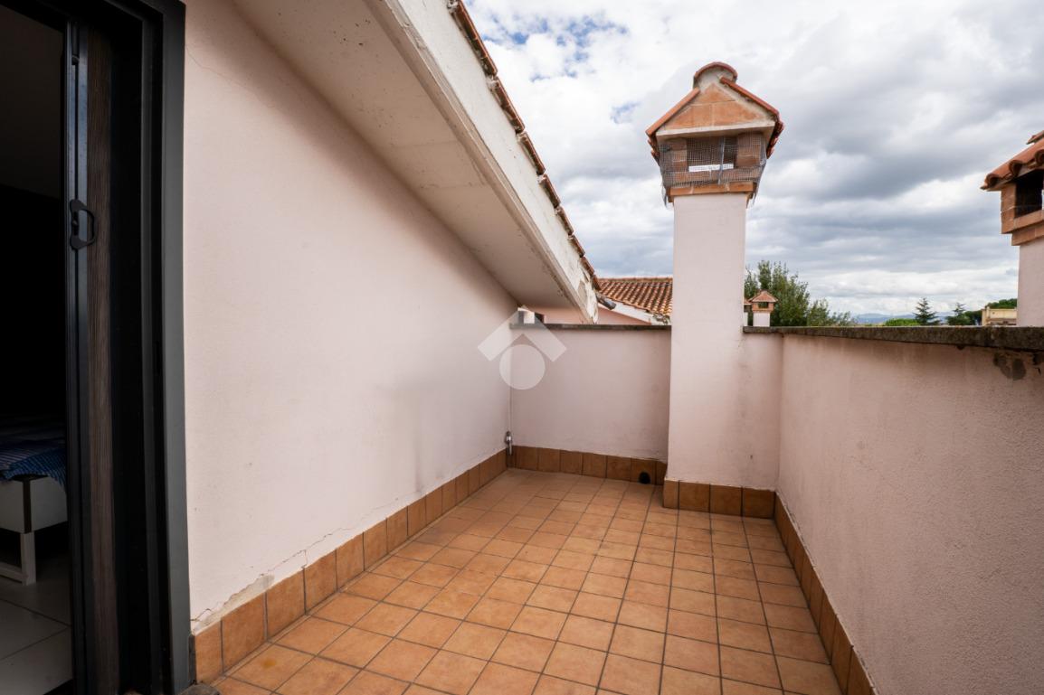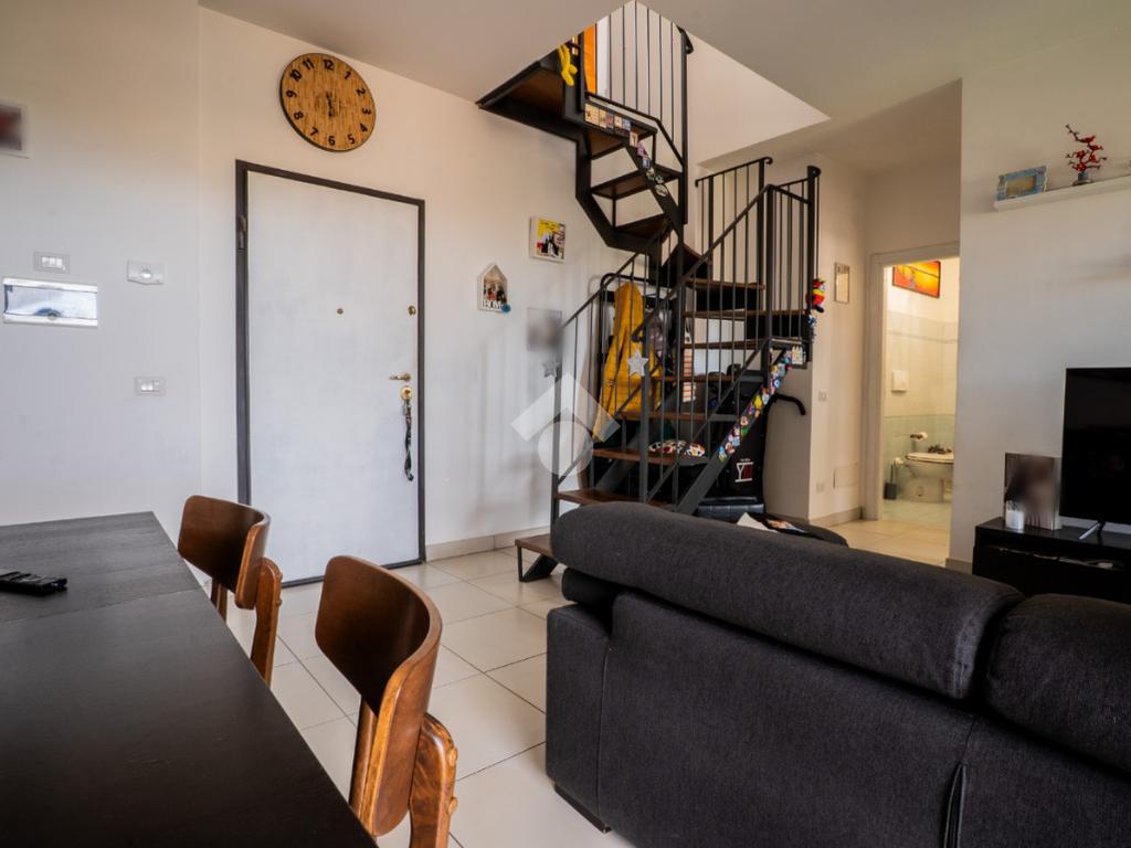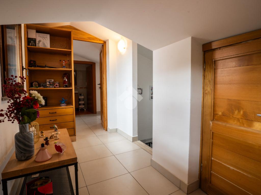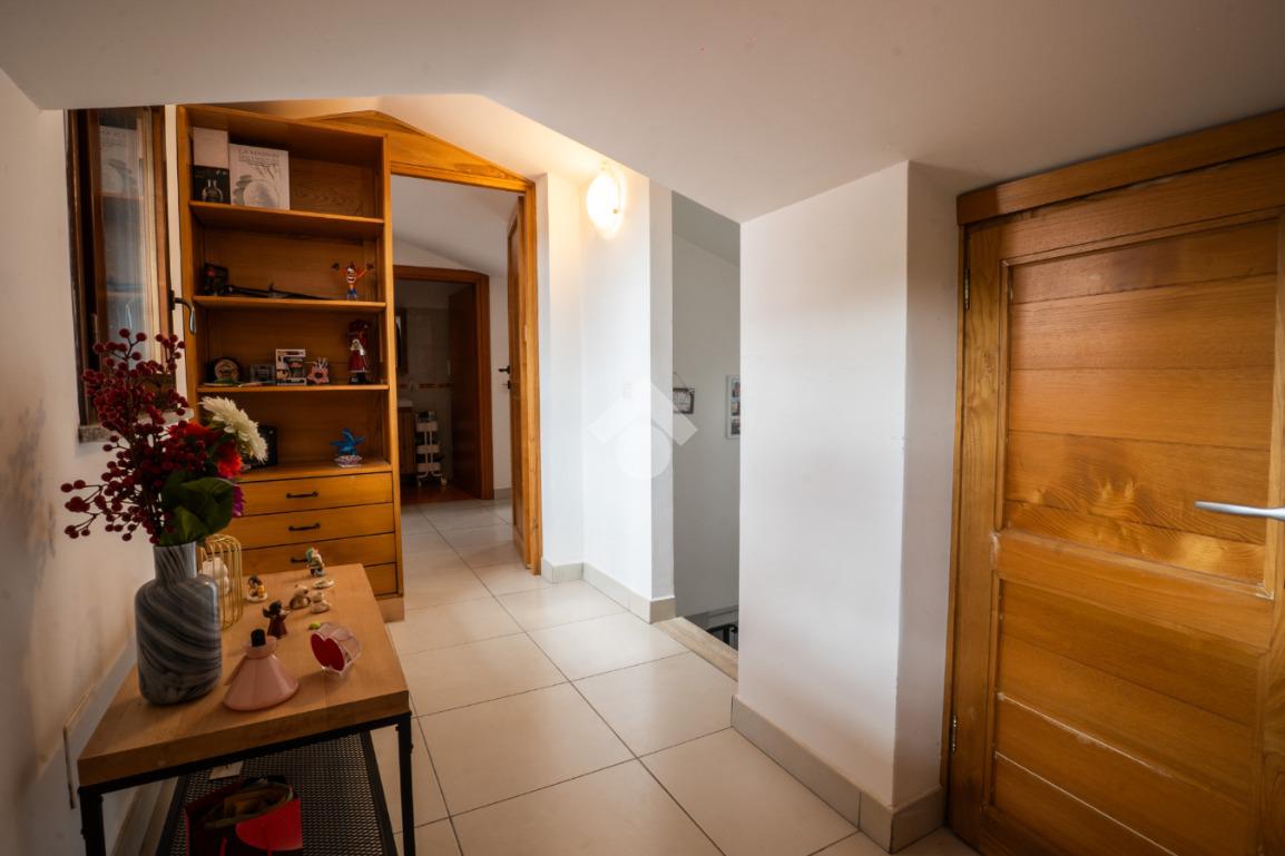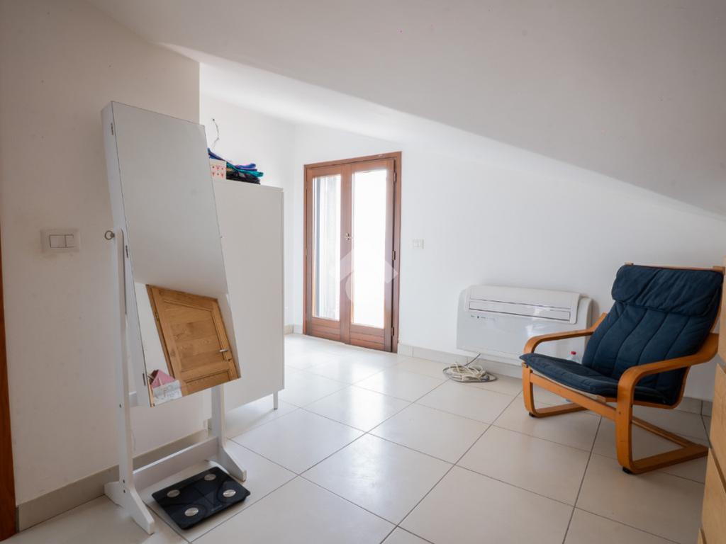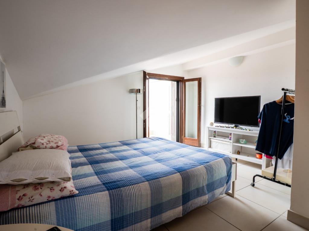 La scala interna conduce al piano superiore, leggermente mansardato, dove si sviluppa una seconda camera, un secondo bagno cieco con doccia e due terrazzini aggiuntivi che regalano luminosità e sfogo esterno anche alla zona notte.