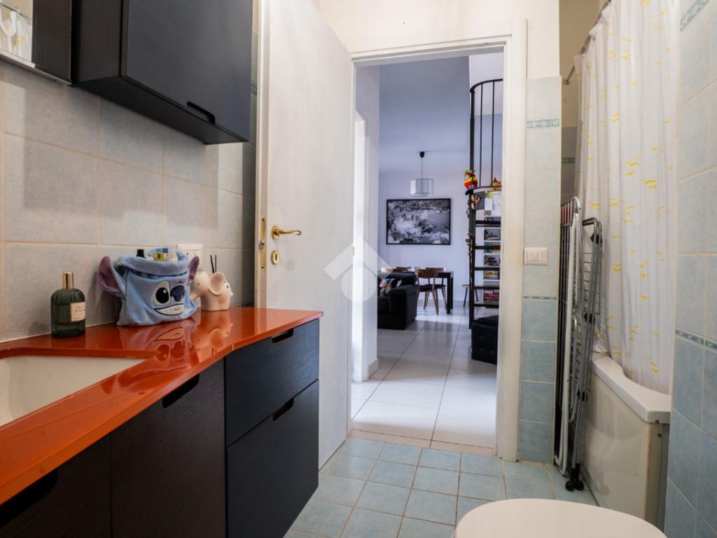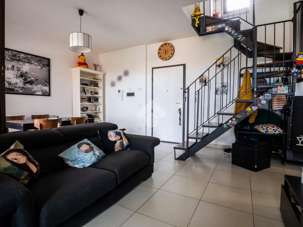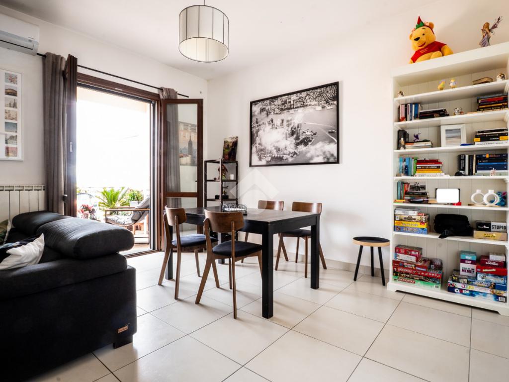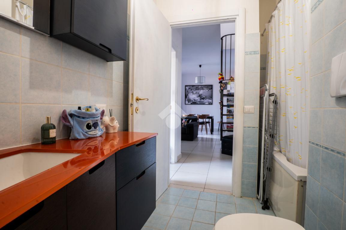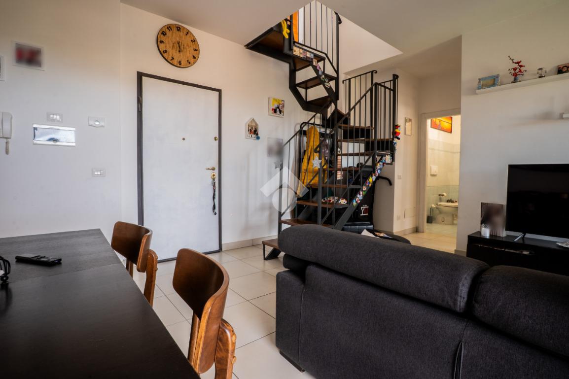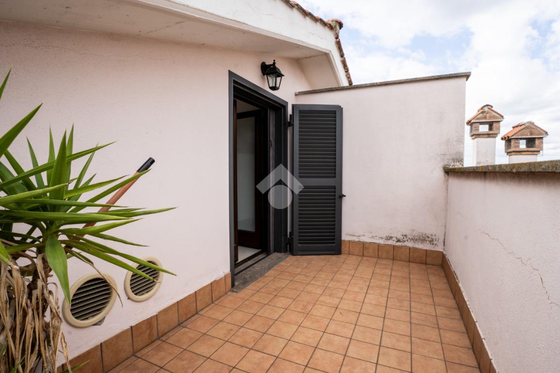 La scala interna conduce al piano superiore, leggermente mansardato, dove si sviluppa una seconda camera, un secondo bagno cieco con doccia e due terrazzini aggiuntivi che regalano luminosità e sfogo esterno anche alla zona notte.